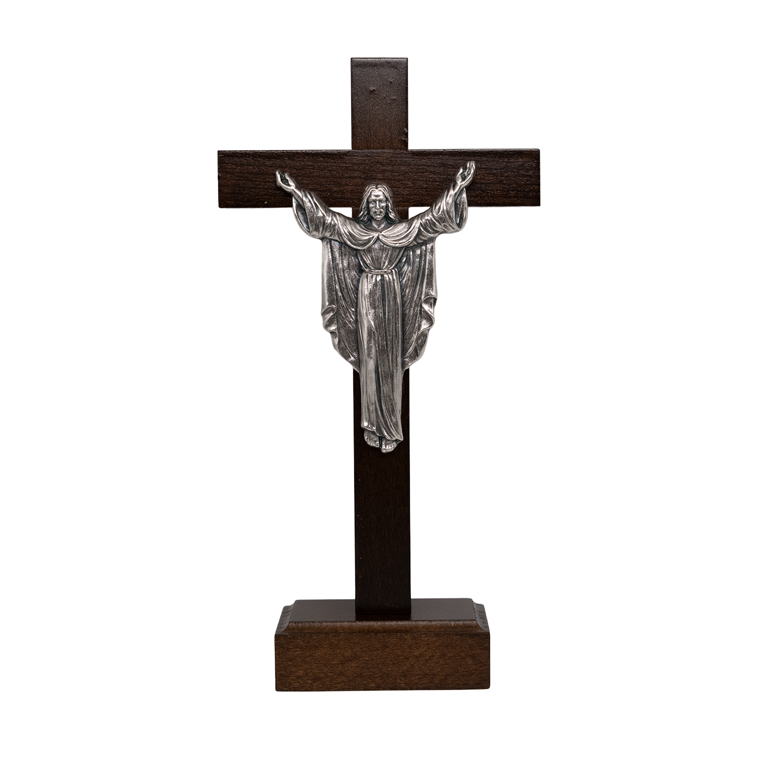 Crocifisso realizzato in legno di noce e metallo, dotato di basetta per appoggio da tavolo. L'iconografia di Gesù, finemente lavorata a mano, è quella del Cristo Risorto.