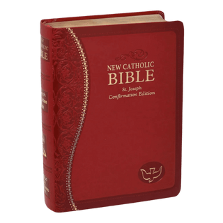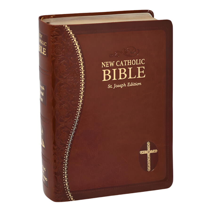 Nuova Bibbia Cattolica (St Joseph ed.) in inglese rilegata in pelle marrone. La copertina e il taglio delle pagine sono lavorati con foglia d'oro.