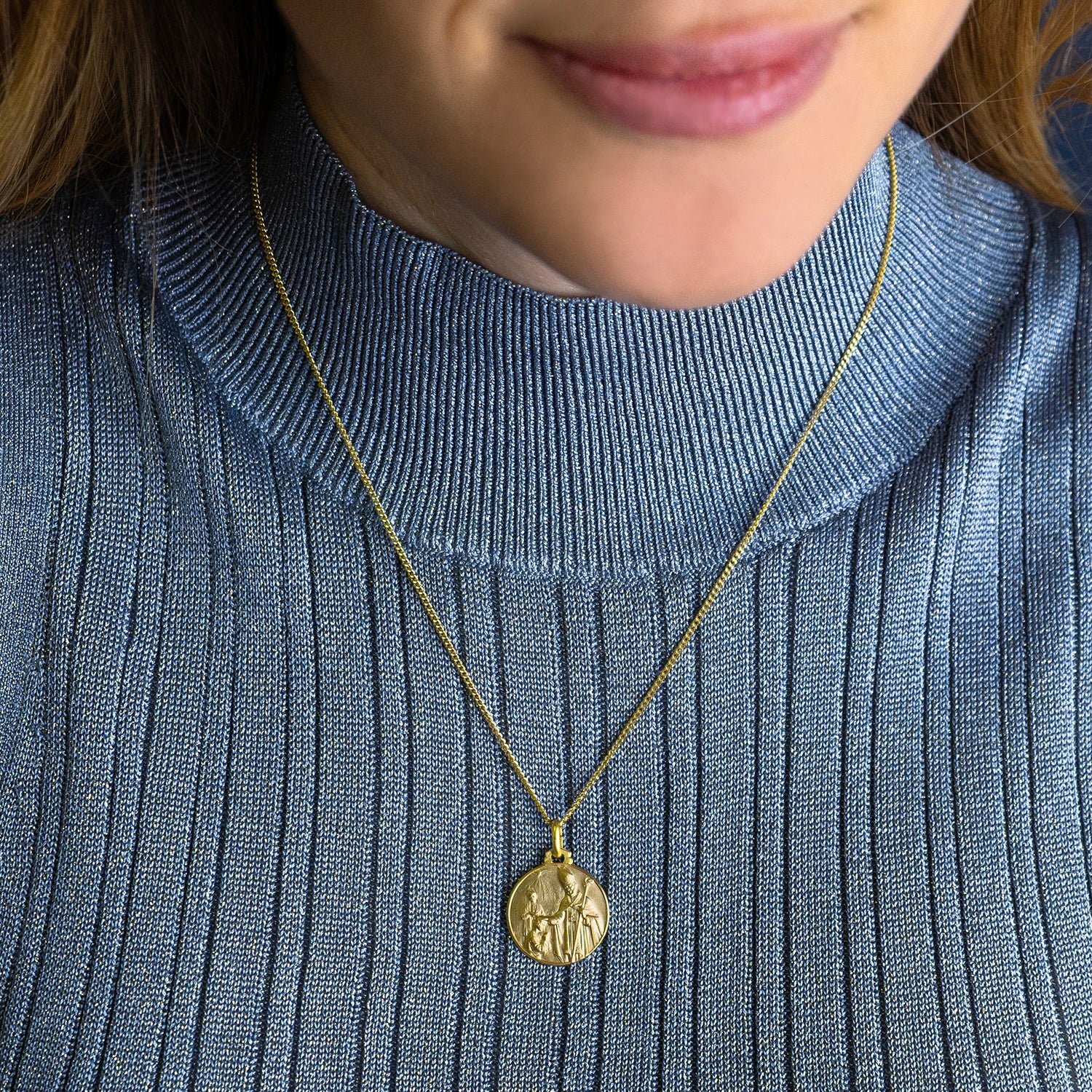 Il rilevo della medaglia ci propone la scena della Cresima, nel momento in cui il Vescovo unge la fronte del cresimante con il sacro crisma, l’olio santo di Gesù. I dettagli ben curati sottolineano la sacra funzione, la presenza del testimone e di una colomba in alto che simboleggia lo Spirito Santo. Gli artigiani hanno dato sfoggio della loro grande abilità, evidenziando soprattutto gli abiti e la scena che fa intuire la funzione sacramentale.
