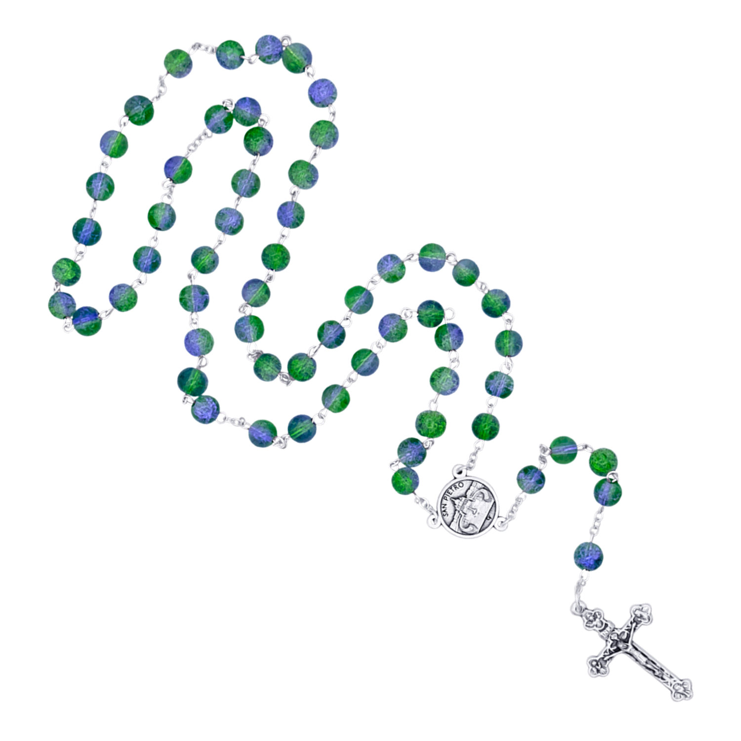 I grani in vetro bicolore verde e viola conferiscono a questo rosario un carattere vibrante e luminoso, esaltato dalla resistente rilegatura in metallo. Al centro, la medaglia raffigurante Piazza San Pietro aggiunge un punto focale simbolico e spirituale, completando un design al tempo stesso classico e ricco di calore espressivo.