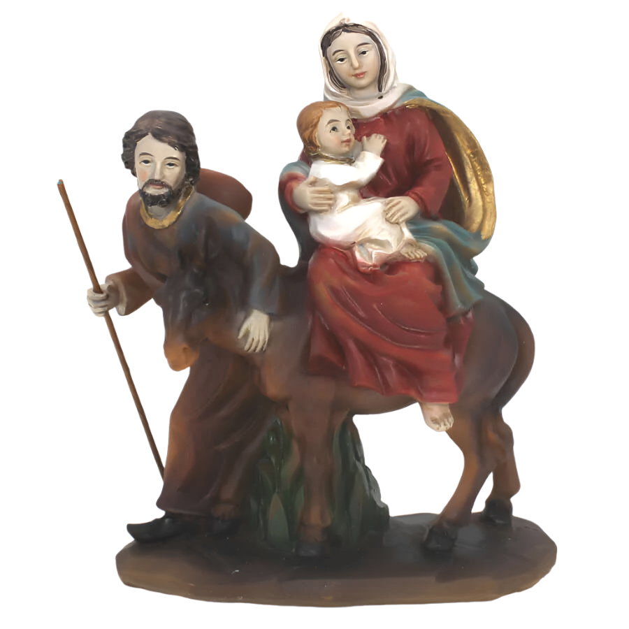 Sacra famiglia in resina dipinta a mano. Maria e Gesù, insieme sull'asinello, sono accompagnati da San Giuseppe nel momento della fuga in Egitto, per scappare dalla Strage degli Innocenti ordinata da Erode.