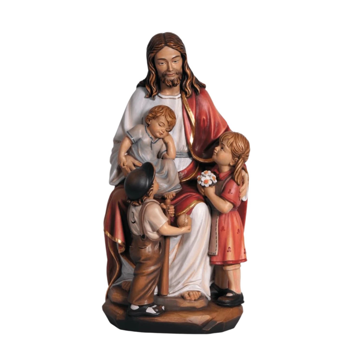 Finemente scolpita e dipinta a mano, questa statua raffigura Gesù nell’atto di accogliere i bambini con dolcezza e amore. Un’espressione serena di affetto sacro, perfetta come regalo cattolico per bambini.