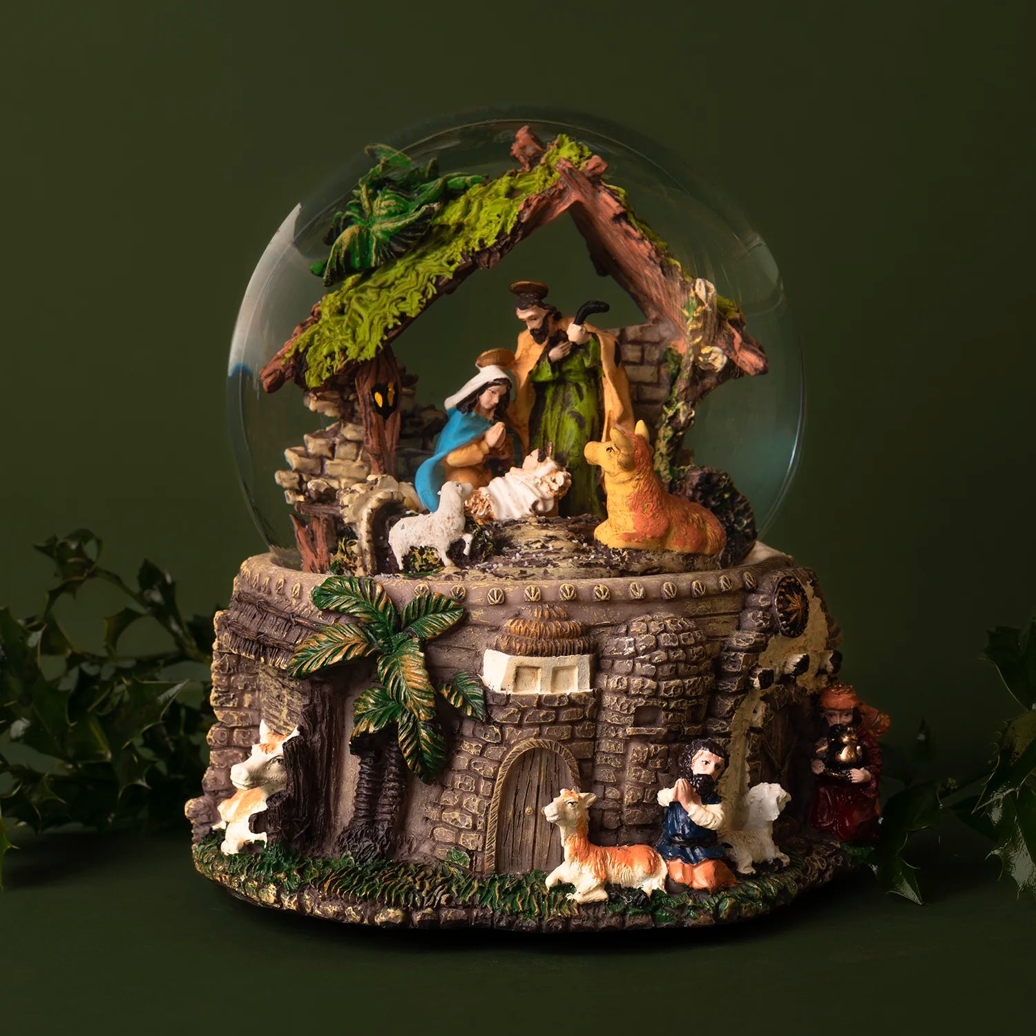 Carillon presepe in palla di neve di grandi dimensioni, realizzato in resina e vetro. La palla di neve con presepe gira al suono di "Silent Night", più comunemente nota come "Astro del ciel".