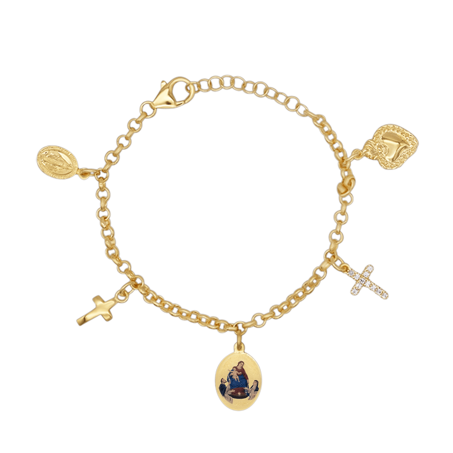 Questo bracciale con charms è una creazione unica nata dalla collaborazione tra Amen e Savelli. Al centro risplende la medaglia della Madonna di Pompei, affiancata da altri simboli cattolici ricchi di significato. Un’espressione compatta e raffinata di fede, pensata per ispirare la devozione quotidiana. Realizzato in ottone dorato.