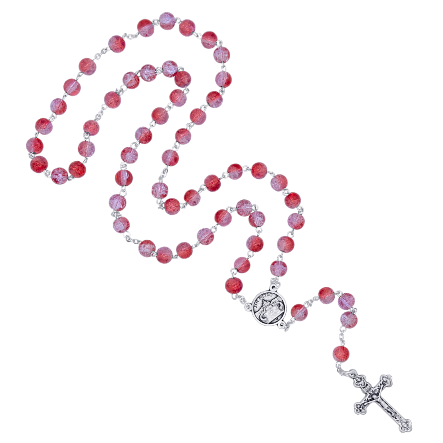 I grani in vetro bicolore rosa e viola conferiscono a questo rosario un carattere vibrante e luminoso, esaltato dalla resistente rilegatura in metallo. Al centro, la medaglia raffigurante Piazza San Pietro aggiunge un punto focale simbolico e spirituale, completando un design al tempo stesso classico e ricco di calore espressivo.