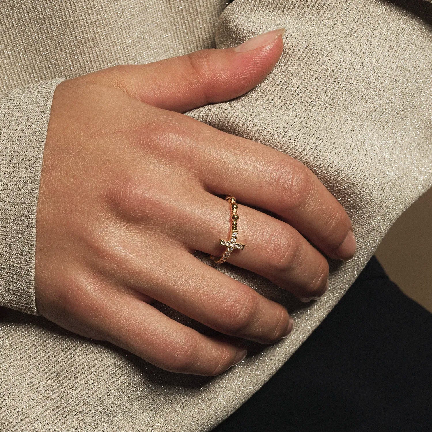 Lo stile classico di questo anello rosario è impreziosito dalla presenza di una luminosa croce di zirconi bianchi. Realizzato in argento placcato oro 18k, questo rosario a dito è il modo migliore per pregare il rosario in ogni momento della giornata. Disponibile in diverse misure.