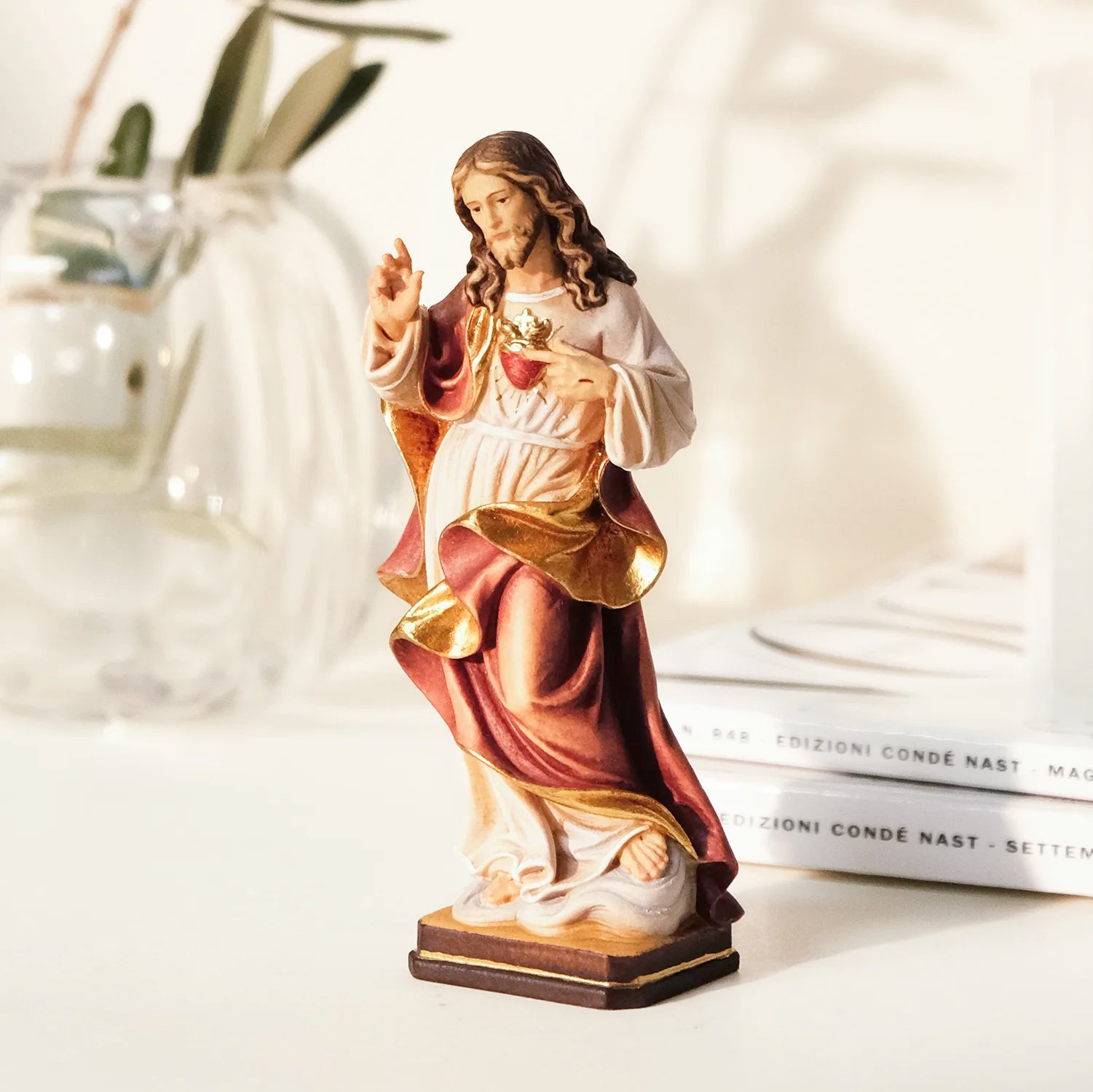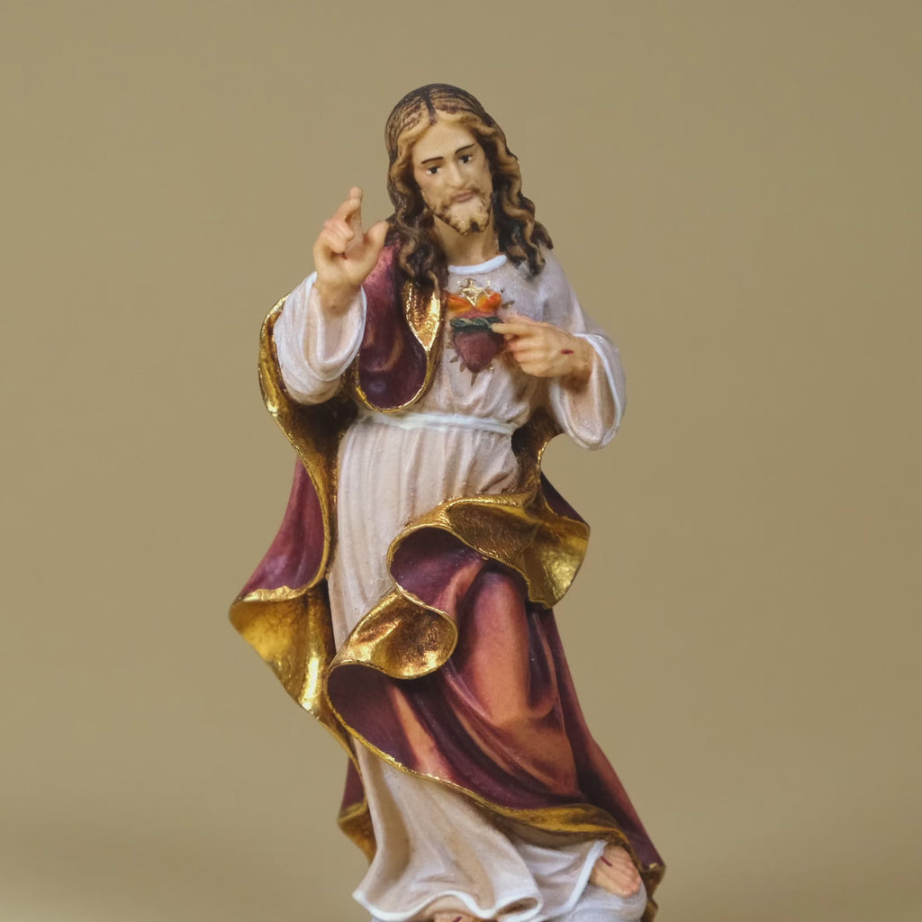 Statua del Sacro Cuore di Gesù realizzata in legno intagliato e dipinto a mano da artigiani italiani.