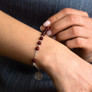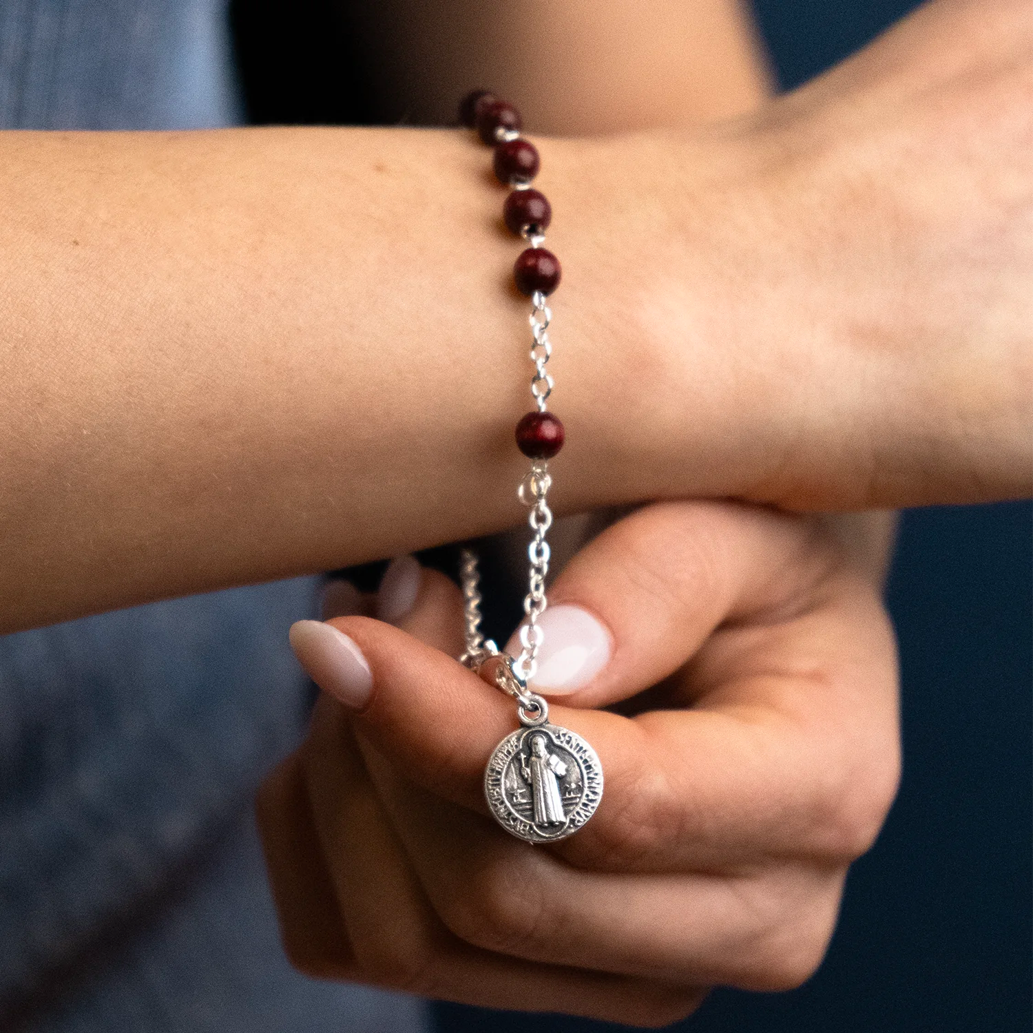 Bracciale rosario con grani in legno, rilegatura in metallo e medaglia di San Benedetto pendente. Simbolo di protezione dal male, la medaglia di San Benedetto è un devozionale potentissimo, perfetto per augurare a qualcuno protezione e sicurezza.