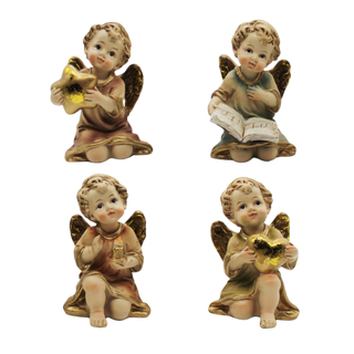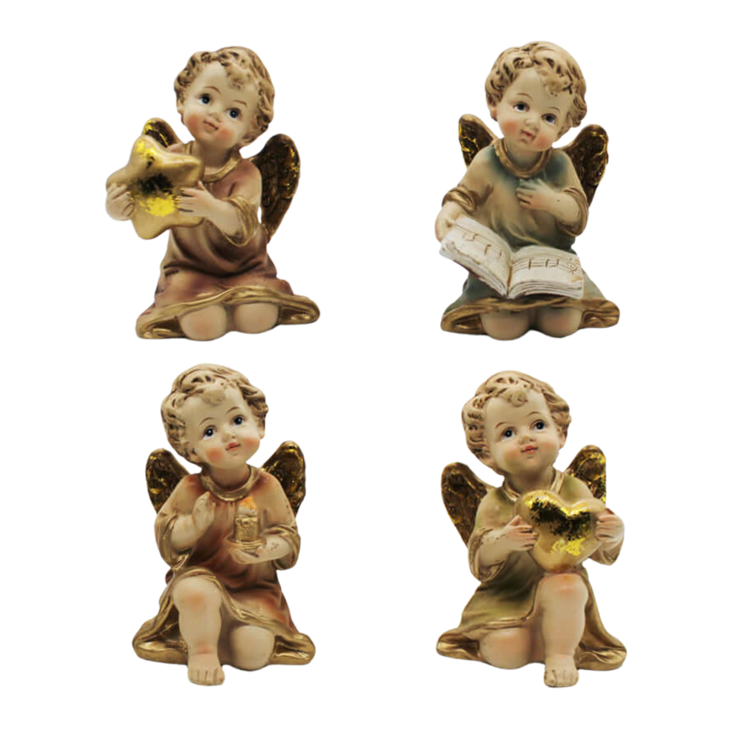 Set di quattro Angioletti natalizi soprammobile realizzati in resina dipinta a mano. Un ornamento natalizio adatto anche come regalo per bambini.