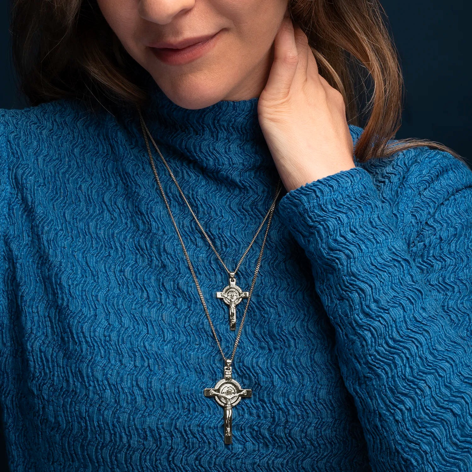 Impreziosito da zirconi, questo crocifisso in argento 925 presenta l'iconica medaglia di San Benedetto, nota per la sua potente preghiera di esorcismo contro Satana. Da abbinare a una catena d'argento.