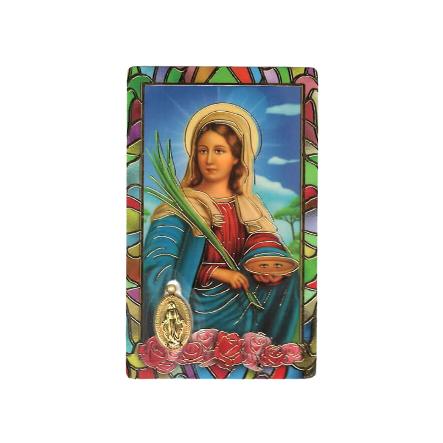 Santino in PVC con immagine di Santa Lucia, impreziosito da dettagli in colore oro e una medaglia miracolosa in metallo dorato. Sul retro è riportata la frase "Prega per noi" in italiano, portoghese, spagnolo, polacco, inglese e francese. Da portare sempre con te.