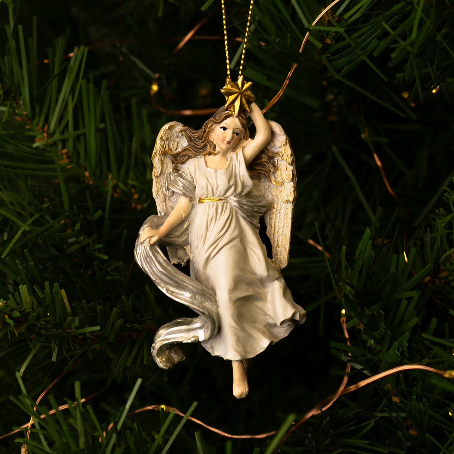 This Chrsitmas Angel ornament is a beautifully detailed decoration, perfect for bringing a touch of grace to your Christmas tree. The angel is depicted holding a golden star, dressed in flowing white robes with delicate golden accents on her wings and belt. The soft features and intricate design make this ornament a standout piece for your Christmas collection. Thanks to the attached golden thread, this ornament can easily be hung on your Christmas tree, adding a Catholic touch to your festive décor.
