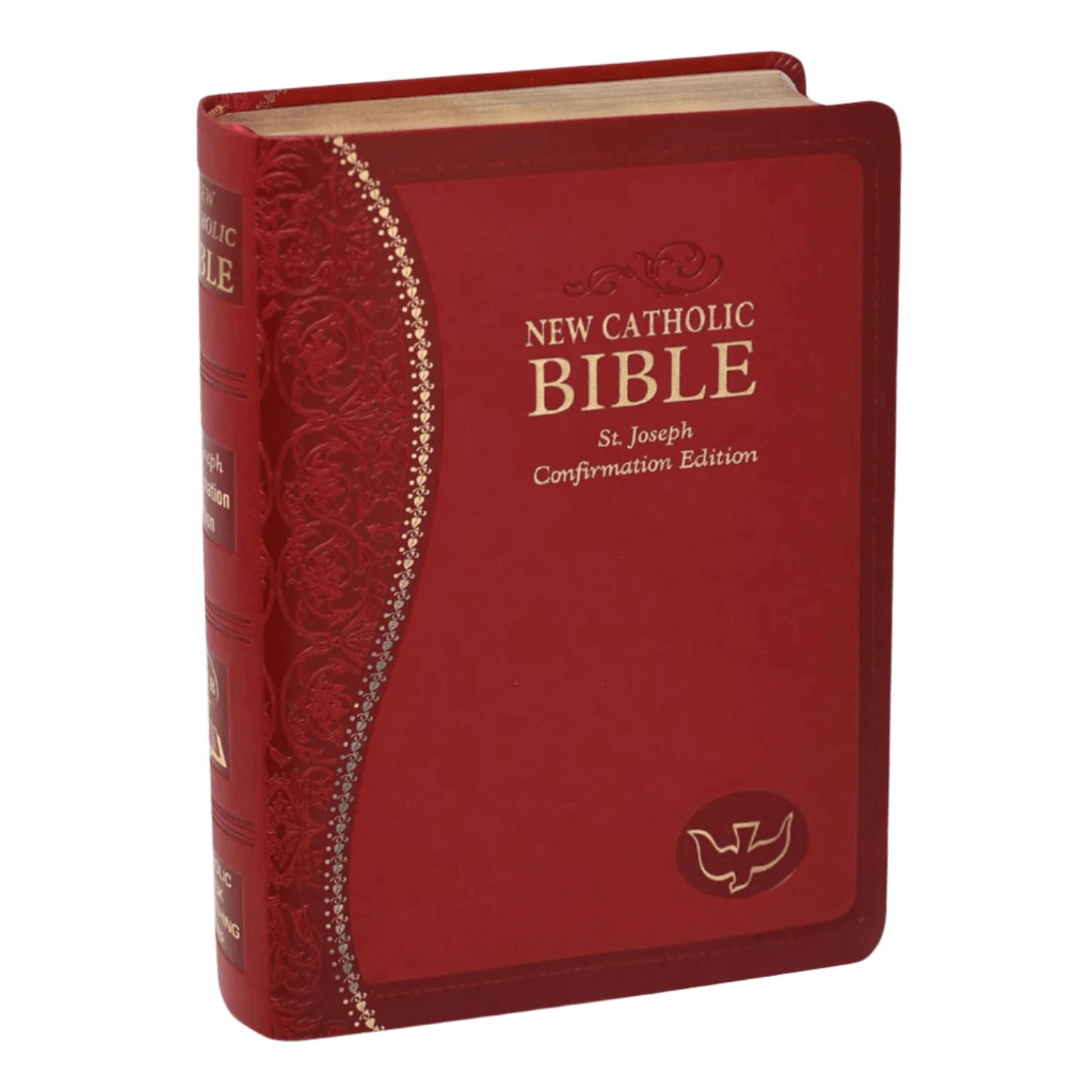 New Catholic Bible (St Joseph edition) in English. The Holy Bible has a red synthetic leather binding with gilded stamping to front cover and gilt page edges.