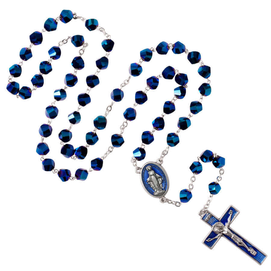 Large deep blue beads, symbol of spirituality and wisdom, compose this metal rosary with a modern design. The central Miraculous Medal and the enameled crucifix pendant give it a touch of uniqueness, making it one of the most loved of the Savelli collection.