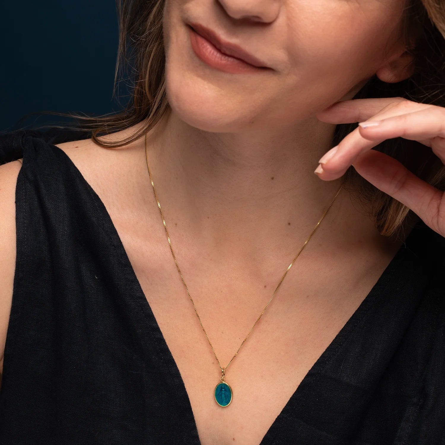 Vermeil Sterling Silver Miraculous Medal coated with blue enamel. The colored touch of this Virgin Mary pendant makes it a perfect gift idea for girls, especially on their First Communion or Confirmation day.