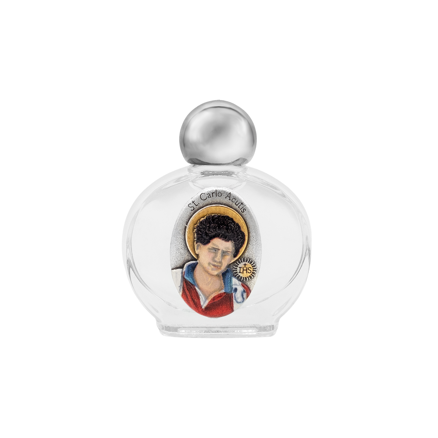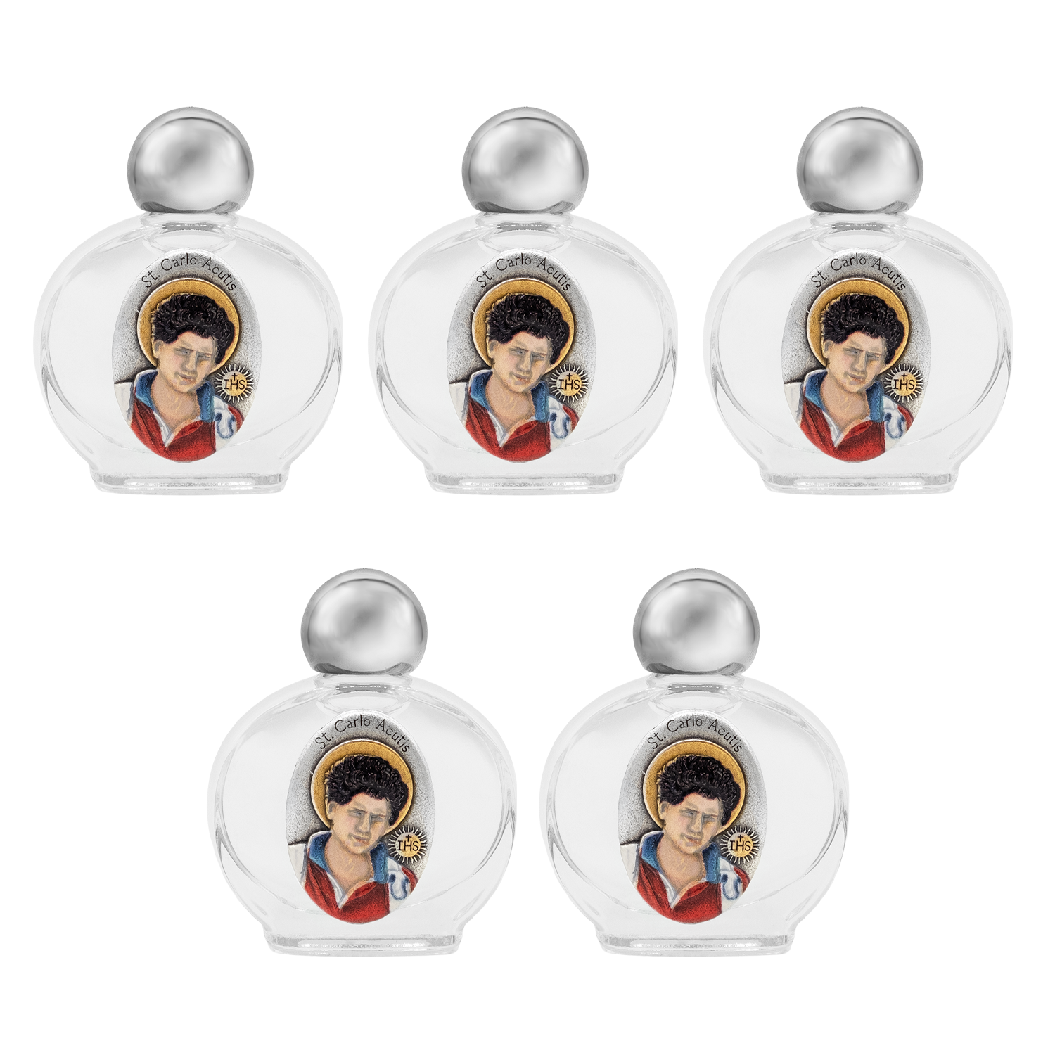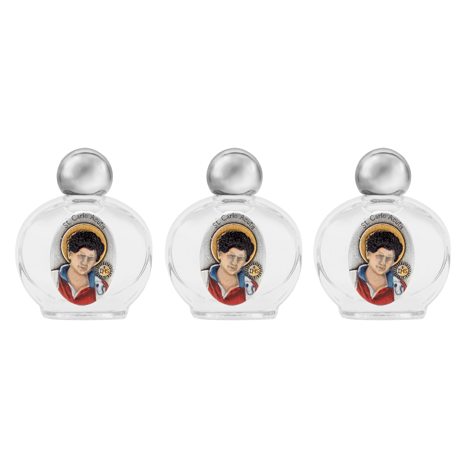 Set of 10 ml glass bottles with metal foil depicting Carlo Acutis, available in sets of 3 or 5 pieces.