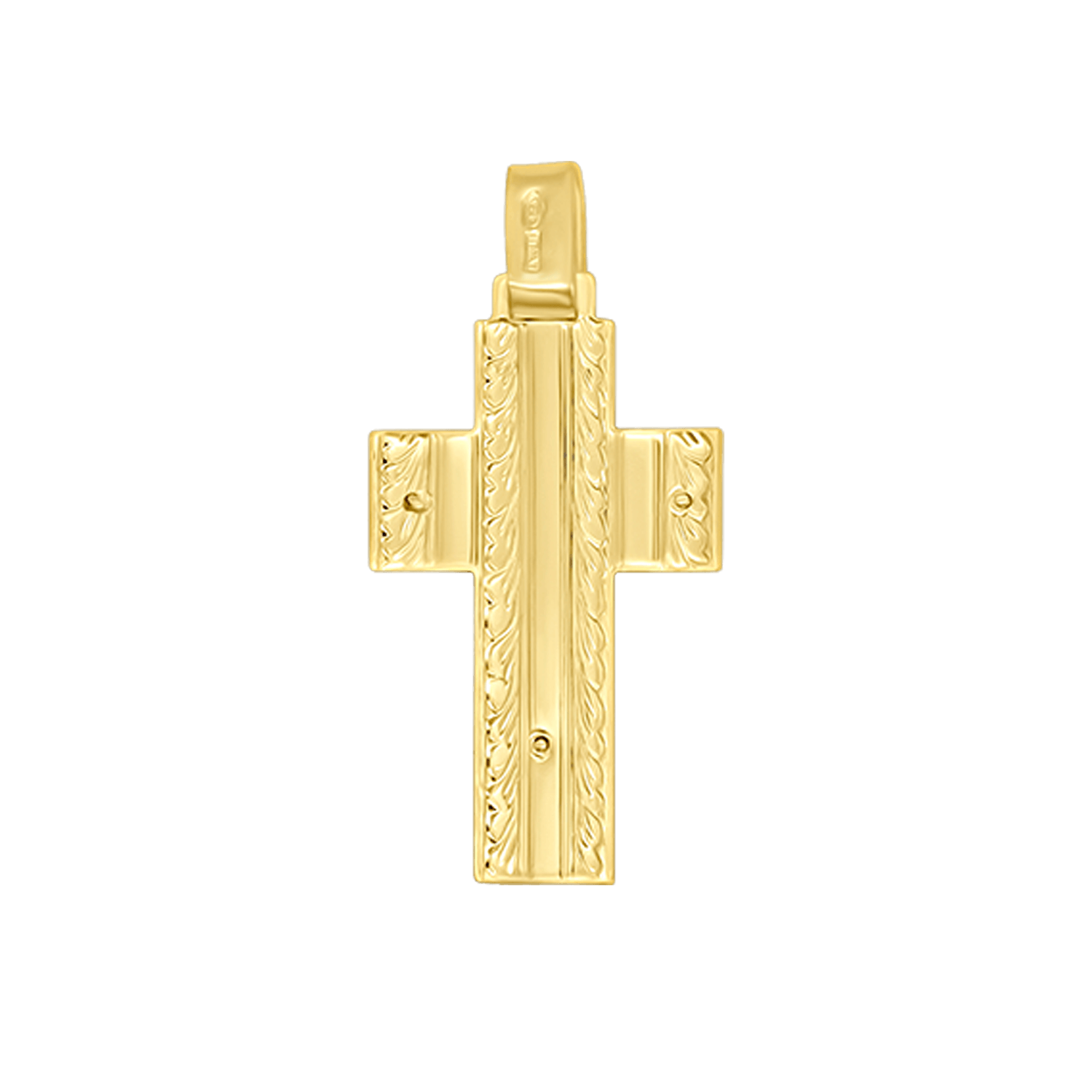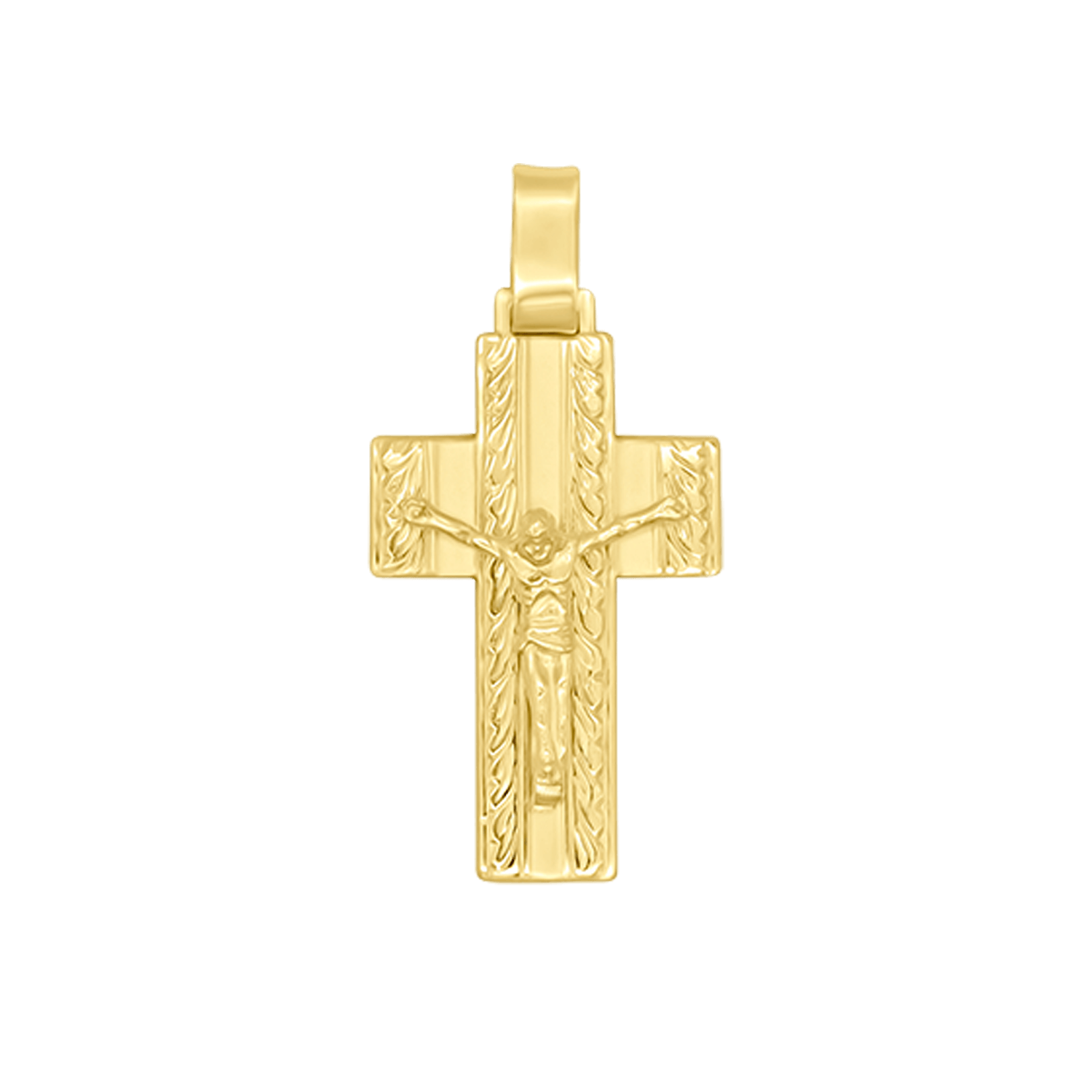 Crafted in sterling silver with an 18k gold finish, this elegant crucifix pendant features intricate engravings and a finely sculpted corpus. A luminous expression of timeless devotion.