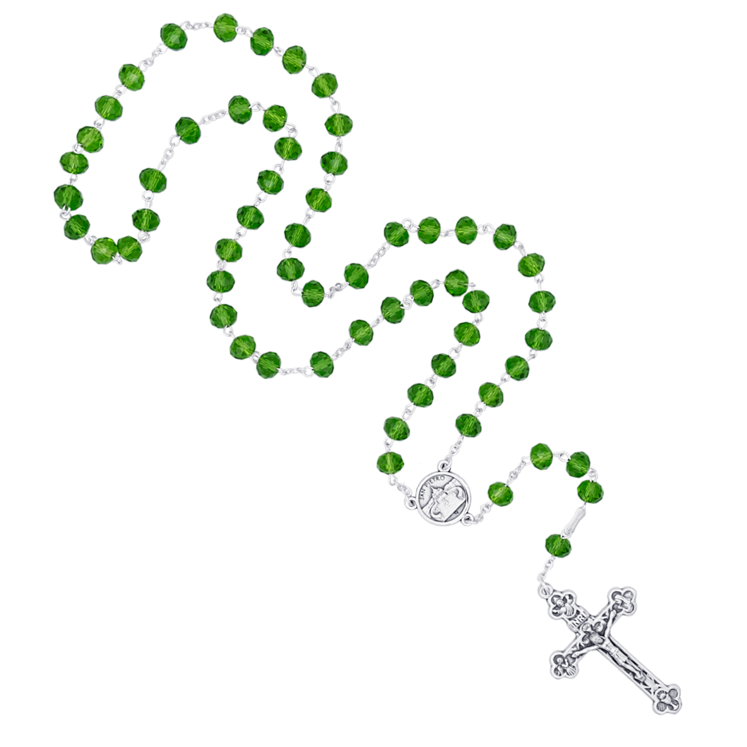Symbol of hope, devotion and fidelity, the green semi-crystal beads give this rosary a classic and essential style. The centerpiece features the iconic St Peter's basilica.