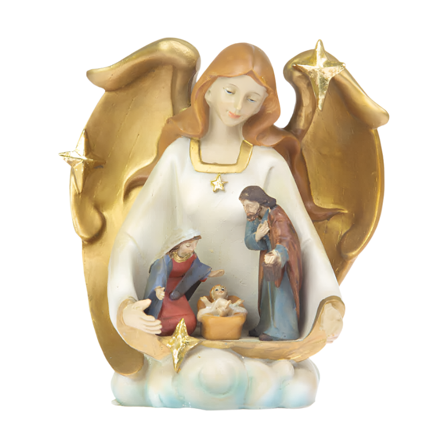 Resin statue of the Holy Family in a protective embrace of an Angel. This Nativity scene represents the Virgin Mary, the Infant Jesus and St. Joseph, standing upon an angel's hands. This tender resin statue representing a golden-wings angel could be such a nice Christmas gift for a Christian family. Adorn your home with authentic Christmas angel decorations and let the spirit of Christmas in.