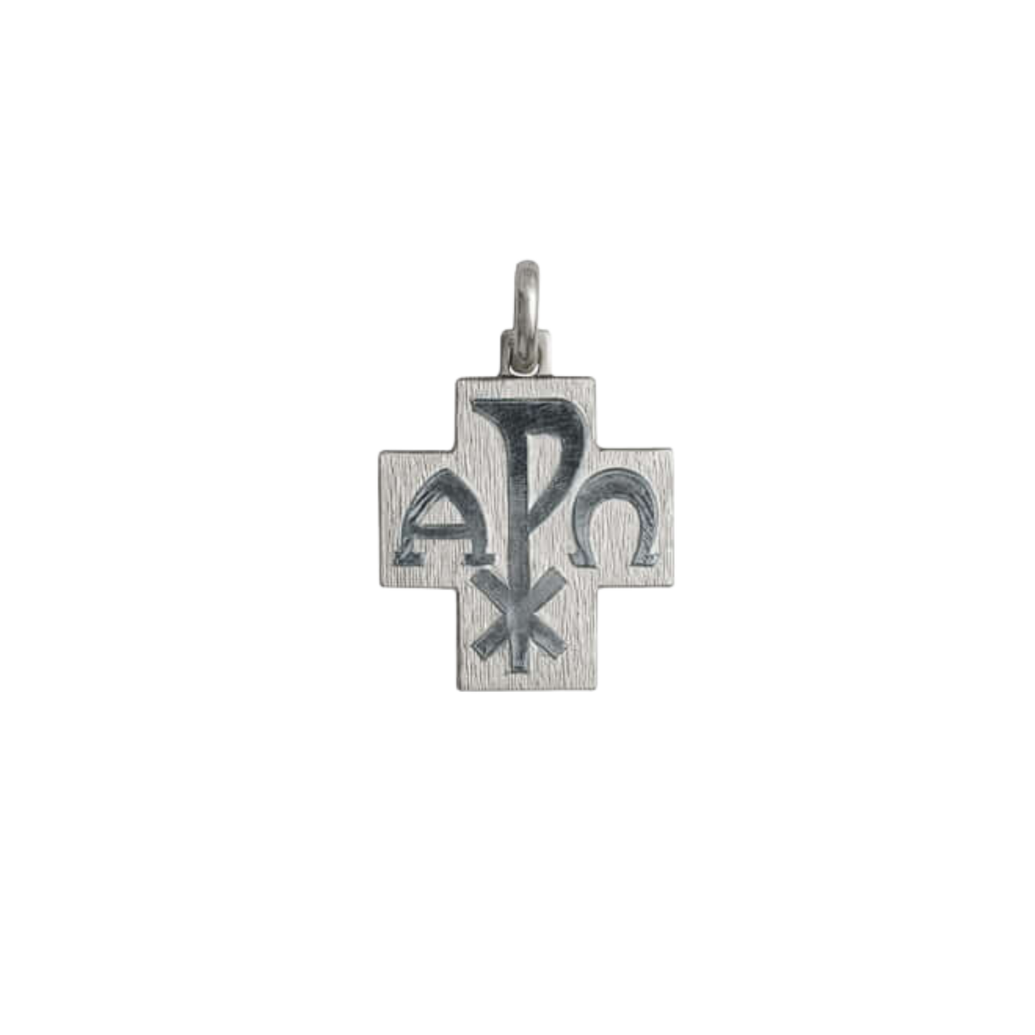18K white Gold Peace cross. The symbols on it are the first and last letters of the Greek alphabet, the Alpha and the Omega, which stand for the first, and the last, the beginning and the end, the one who is and has been and is coming. This cross may be given as a token of hope, redemption and peace. Available in two different sizes.16x15 mm or 24x22 mm.