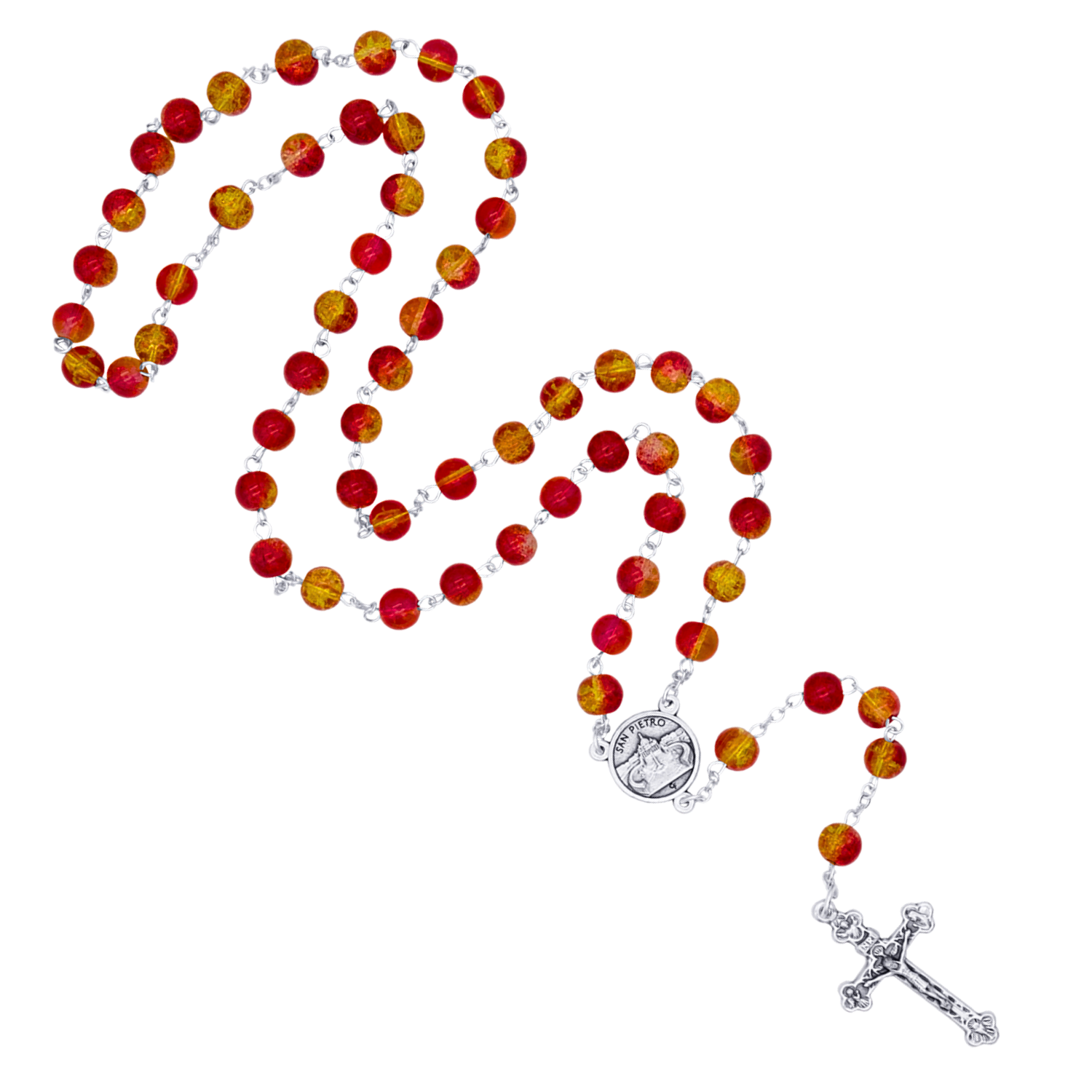 The red and yellow two-tone glass beads give this rosary a vibrant and luminous character, enhanced by the refined metal binding. At the center, the medal featuring St. Peter’s Square adds a symbolic and spiritual focal point, completing a design that is both classic and full of expressive warmth.