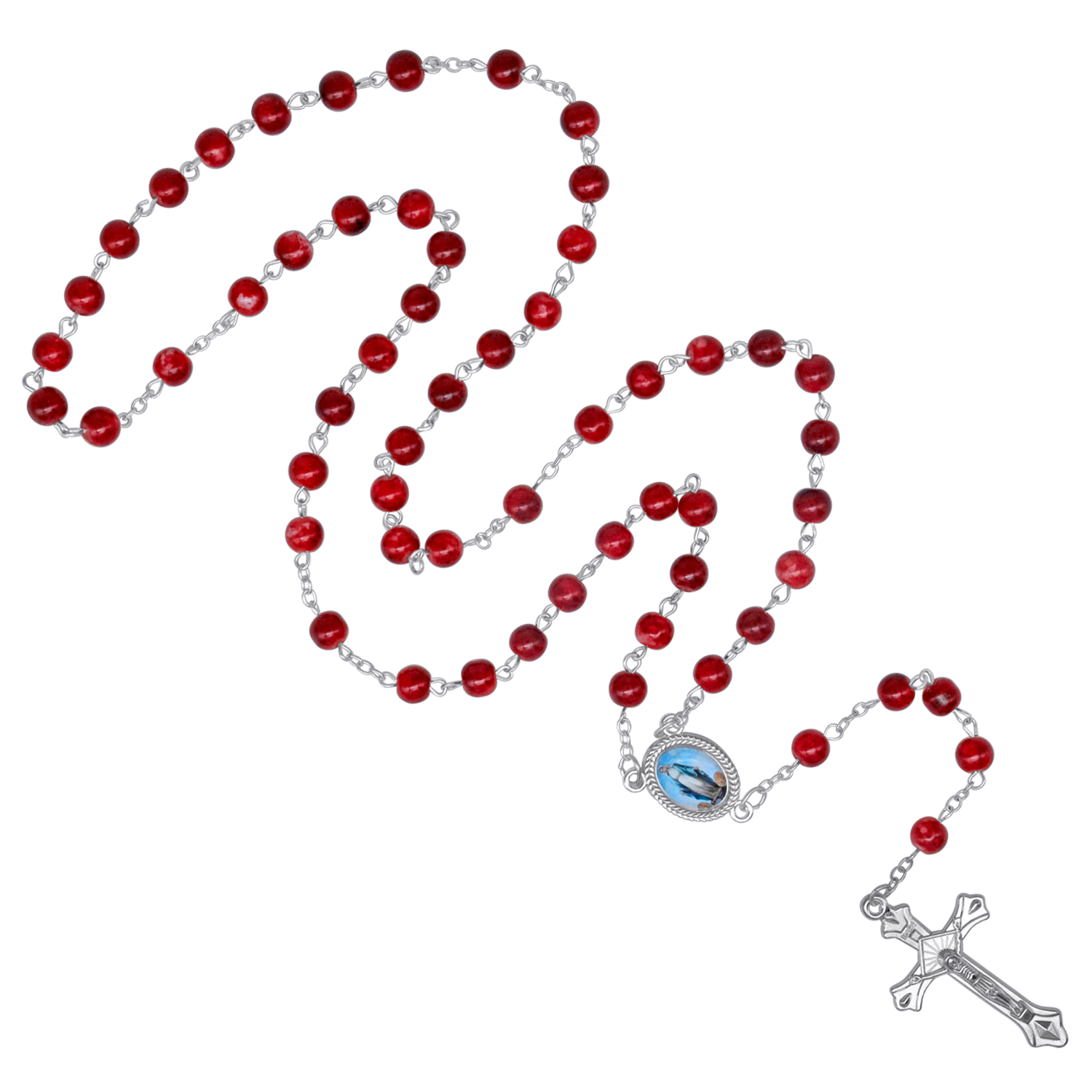 Holy rosary for your daily prayers at home, featuring large red glass beads with marble effect and metal binding. The central medal of the rosary depicts the Blessed Mother of Jesus, the Holy Virgin Mary.