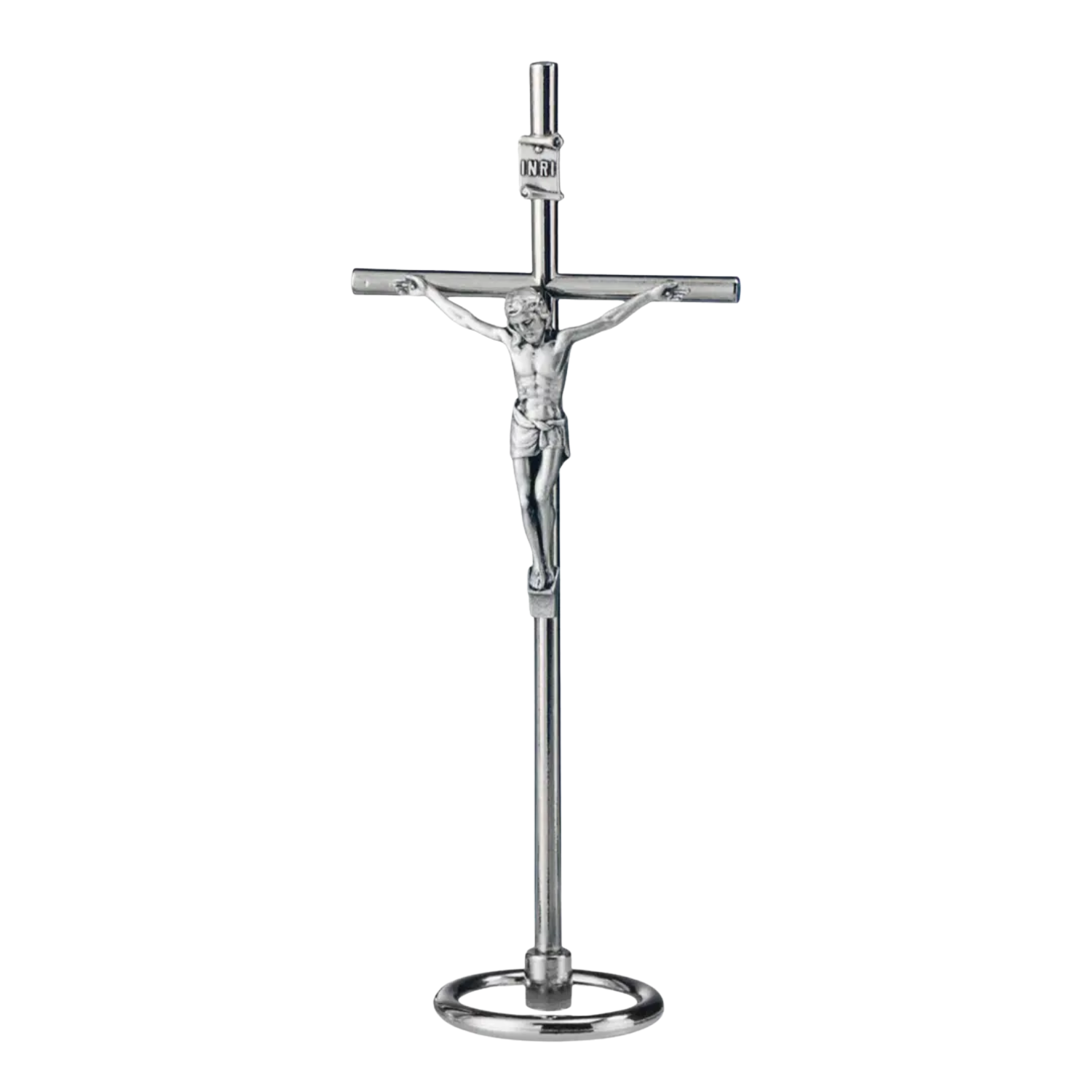 A contemporary and essential design characterizes this table crucifix, crafted entirely from metal and featuring a base for stability on any tabletop. Intended for display in your home, it serves as a symbol of protection for you and your family and stands as a tangible expression of Christian faith.